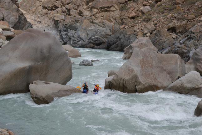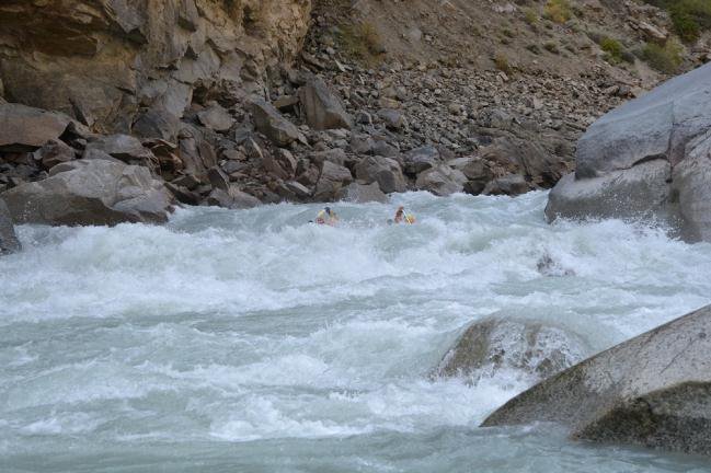 Как нам и рассказывали знающие товарищи – Саня Лабеев, бывший на Сарыджазе аж 4 раза, — «Пограничник» является неким началом «настоящего» Сарыджаза. Особых эмоций он не вызвал, единственное — на выходе несет на стенку левого берега. Наш катер прошел по задуманной траектории, но все же слегка чирканул по ней. Равилевцы, не вняв советам Старого, пошли заведомо хуже, и в стену влетели со всего маху. Выглядело все не особо криминально, но все равно неприятно.