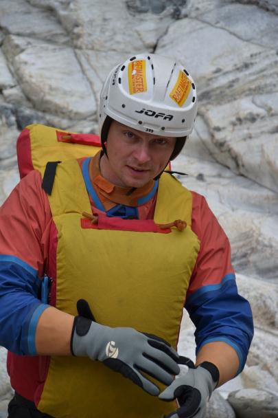 Первый порожек, который мы смотрели, представлял собой свал воды в сужении с неприятной сбойкой струй. Наш катер пошел первым и, в итоге, мы неплохо попозировали на фото/видео, слегка притопив Вовчика 🙂 .