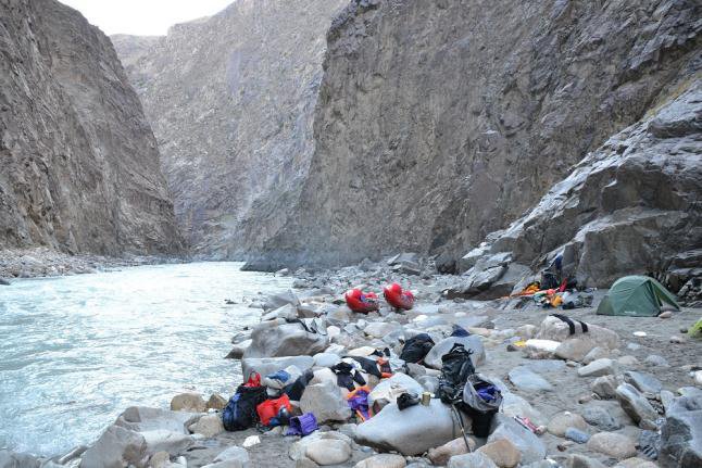 После последнего (правого) прижима, уже на выходе из каньона, нашим товарищам удалось зачалиться и мы решили встать на ночевку.