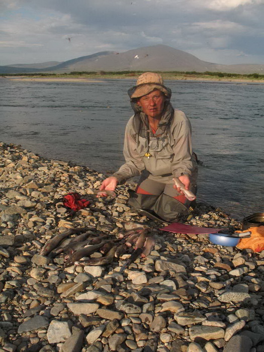 Днем пасмурно и ветрено, но хариус ловится. Наловили много — на сагудай пойдут тушки. Уху сделаем из голов и хвостов.