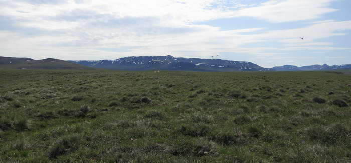 Зачалились для стоянки на галечнике, который ровной линией граничит с моей любимой тундровой подстилкой — сплошной ковер сплетенных растений. Босиком ходить не то что можно — НУЖНО! Но только в толстых носках, иначе сожрут!