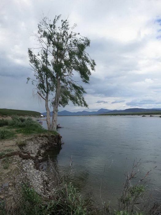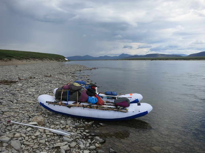 Из последних сил цепляясь за последние метры излучины правого пологого берега, мы не даем ветру оторвать себя от него, пока позволяет глубина, выпрыгиваем и тащим к берегу кат бечевой. Полное усилие двух человек понадобилось, чтобы против ветра подтащить кат к мели и поскорей вытащить его на сушу. Но и тут он мог ещё улететь в противоположный берег, в коварные кусты. Снимаем с ката рюкзаки и, против обыкновения, тащим к ближайшему дереву сначала кат, а потом уже, привязав его, несём туда же рюкзаки.