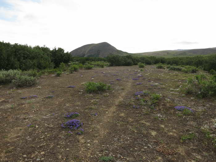 За устьем маленькой протоки в довольно густом ольховнике неожиданно обнаруживаются вполне приличные для стоянки песчаные полянки. На них, как на клумбах, тут и там розетками растут мелкие сиреневые цветочки, чередуясь с кучами лосиных орешков. Не сказать даже, каких кучек больше — цветочных или орешковых. Здесь, видимо, лосиный рай.