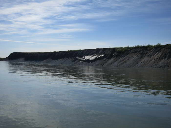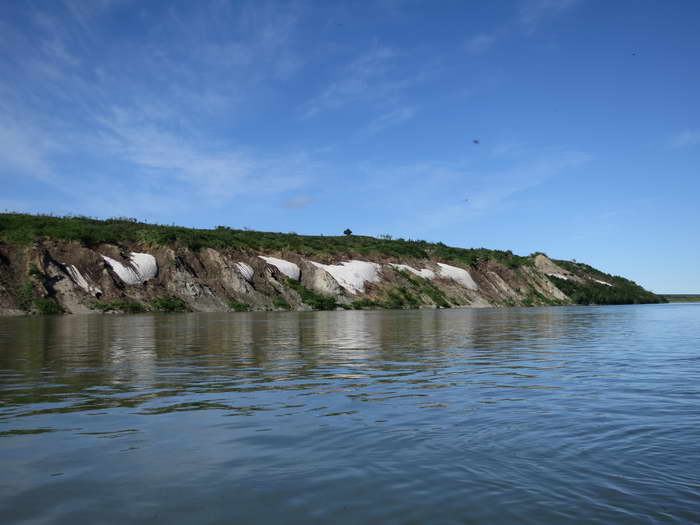 На очень симпатичном мысу в тени широкого тополя мы устраиваемся на обед. Напротив — высокий обрыв правого берега. Не простой обрыв. Под занавесками свисающего дёрна лежат снежники. Лежат они, видимо, на льду вечной мерзлоты, выходы её сверкают на солнце, подтаявшие, мокрые. По ним скатываются вытаивающие камушки, в воду с обрыва они сыпятся непрерывно. Наверное, как раз из таких обрывов вытаивают бивни и кости мамонтов.