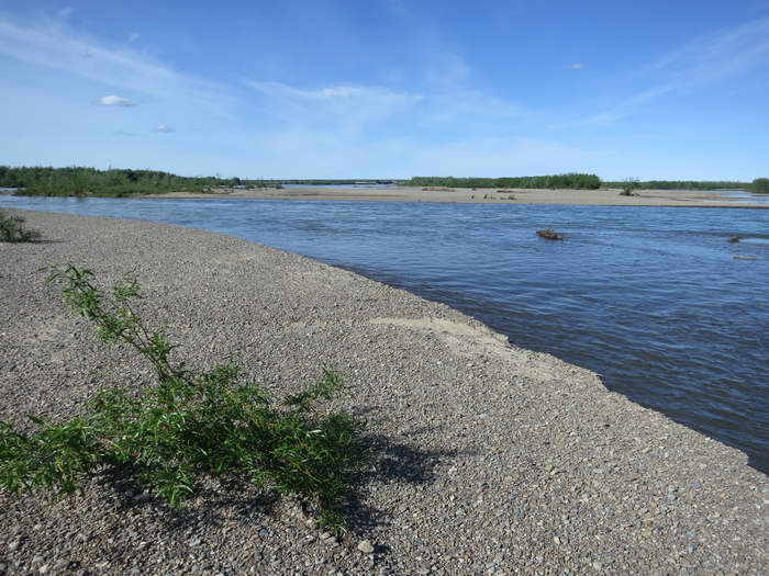Устье находим с точностью до 100 метров. Отличный, надо сказать, результат для пути в несколько сотен километров. Наш обрыв, у которого мы обедали, ещё виден отсюда в просвет между островов. Чуток совсем не дотянули. Но вообще-то хорошо, что мы обедали на том мысу. Здесь, возле устья Афонькиной, на островах либо сплошь густые комариные заросли, либо низкие сырые песчаные намывы.