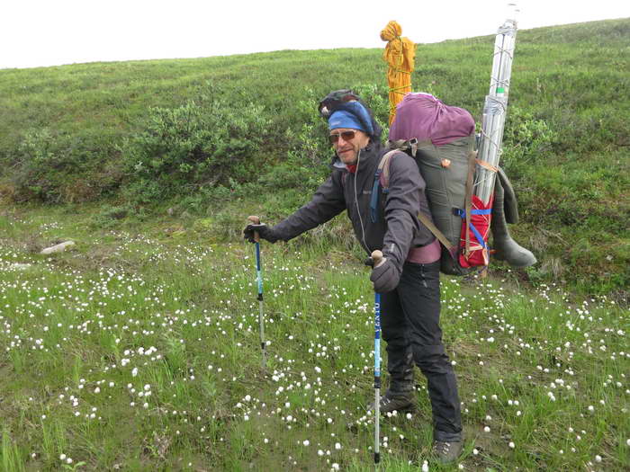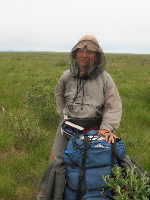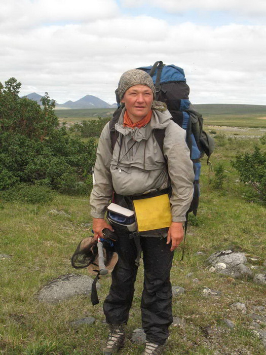 Самая ужасная — кочкарниковая тундра. Именно здесь у нас появилось выражение «центровать кочку» — то есть наступать на её центр так, чтобы под ногой точно оказалась опора. Если шагнуть неточно, то кочка, похожая на голову с торчащими дыбом волосами-травой завалится набекрень, а ты или подвернешь ногу, или потеряешь равновесие. Конечно, между кочками условно твёрдо, правда сыровато, и можно в общем идти и не наступая на кочки. Но тогда придется, как цапля, высоко задирать колени, перешагивая кочки. А с рюкзаком непрерывно так идти довольно тяжело. Поэтому приходится идти «по головам», «центруя» кочки и периодически заваливаясь, нелепо взмахнув палками.