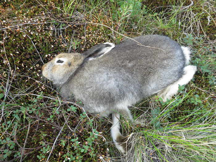 Обходя одну из болотинок замечаем зайца. Дохлого. Что тут у них, заячий мор? Лежит целенький, не облезлый. Не так давно видать лежит. Но почему не объеден хищниками?