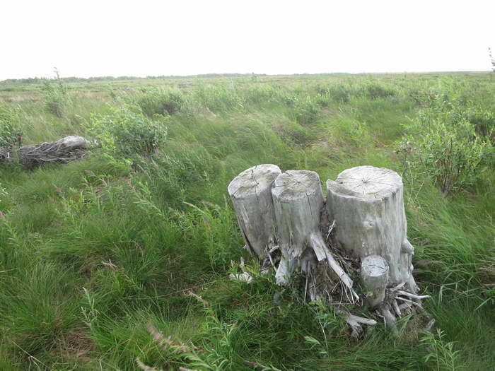 Встретили мы артефакт, объяснения которому я не нашла. Выбеленный временем пень от спиленного дерева о трех стволах торчал просто посреди тундры. Дерево не маленькое, довольно толстым было. Ничего похожего на рощу рядом нет. Травянистая тундра на сотни метров вокруг. И пень. Просто пень.