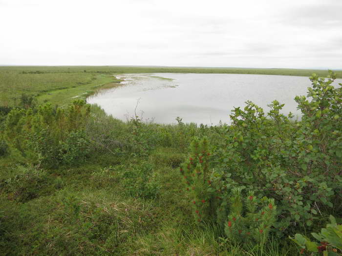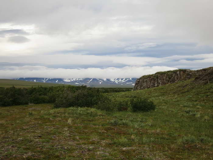 Есть еще интересный вариант тундры — небольшие шестигранные бугры, разделенные глубокими заболоченными канавами-болотцами. Вероятно, это мерзлотный вариант тундры, уж больно эти бугры напоминают мерзлотные вспучивания. Идти по ним тоже нелегко. Канавы частенько не перешагнуть — заболочено, сыро (сапоги-то одеть как обычно лень!), а в бугры подняться очень мешают мягкие мшистые кочки, поросшие жесткой стланиковой березкой. Буксуешь на них, а подняться не можешь. Бугры эти по мере продвижения становились всё больше, и вдруг закончились совершенно внезапно.