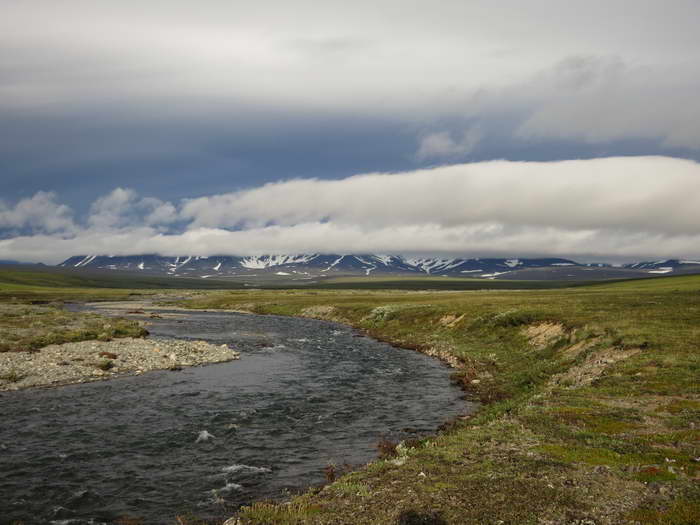 Категорийный каньон реки Поперечная тоже волнует, но я подозреваю, что из-за высокого уровня воды мы его просто не пройдем. Весна на Чукотке запоздала. Недаром в горах ещё полно снега. К тому же вот сегодня поливает — так я, выглянув из дома, вижу, что уровень воды в реке поднялся, островок напротив нас слегка уменьшился в размерах. Кстати, на ставшем более шустрым перекате верхушки волн срывает ветер. А направление его изменилось. Утром он дул со стороны гор, к вечеру зашёл с долины.