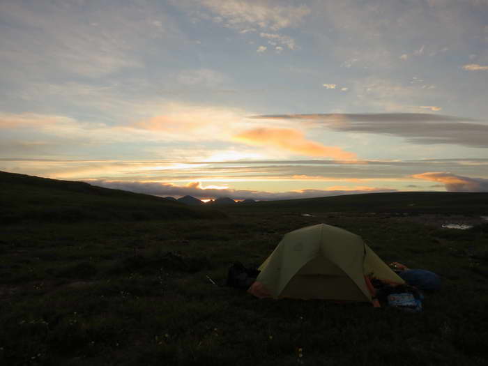 Находим для стоянки отличную тундровую сплетенную низкорослым ковром площадку.