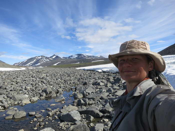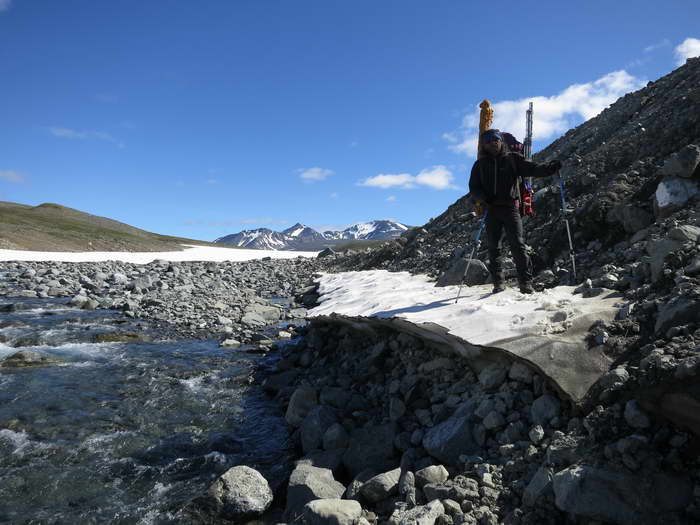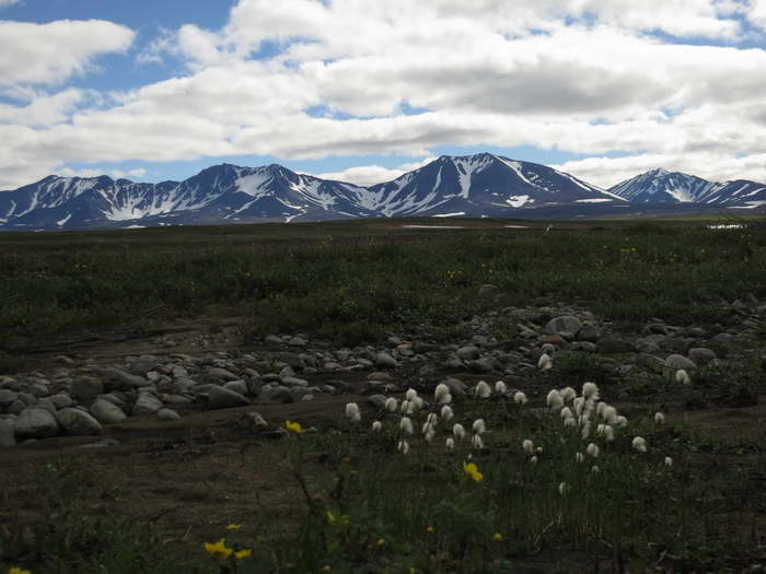 Под несколькими невысокими обрывами текут талые ручьи — здесь еще сохранились недотаявшие снежнички. На них опять обнаруживаем нескольких дохлых зайцев разной степени поеденности. Ситуация для всех одна — снежник. Неужто был такой наст или снегопад, что выбраться из-под снега не смогли? Или просто какой-нибудь заячий мор? Но тогда они валялись бы не только у снежников. Непонятно. Очевидно только, что здесь, ближе к горам, хищников больше, чем в открытой тундре, где заяц лежал абсолютно целый.