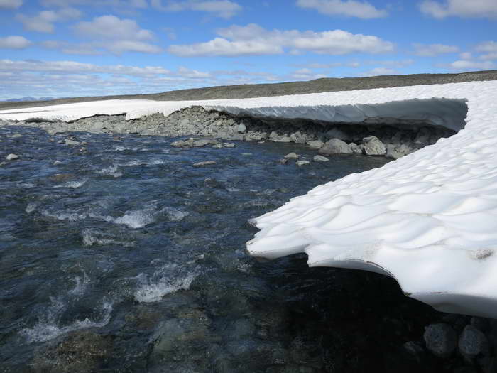 По берегам обширные снежники. Прессованный снег примерз к крутым каменистым склонам, снизу подмыт высокой весенней водой. Получаются либо козырьки метровой толщины, висящие над речным берегом, либо вертикальные каньонообразные стенки, если снежник многометровой толщины.