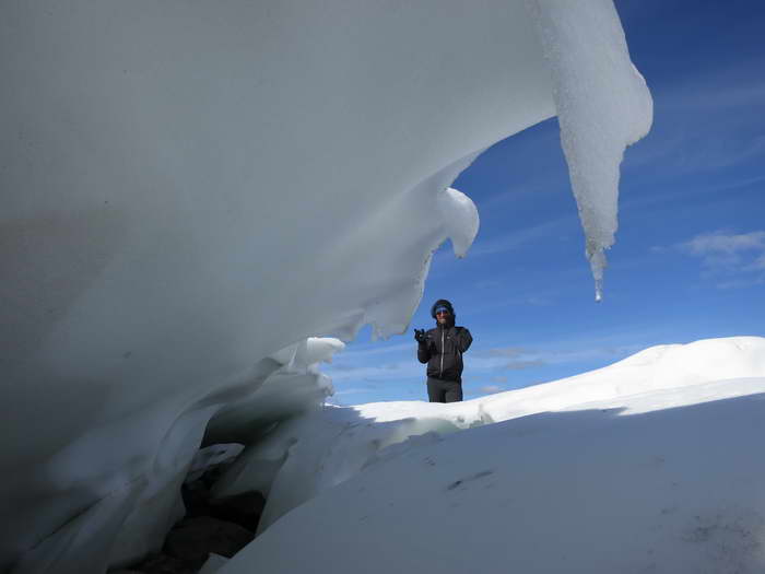 Один из снежников, напоминающий расколовшийся айсберг, подмытый и подточенный водой, вызвал детское желание полазить по его внутренним коридорам, ходам, поснимать причудливые завитки подтаявшего на изломах льда и снега.