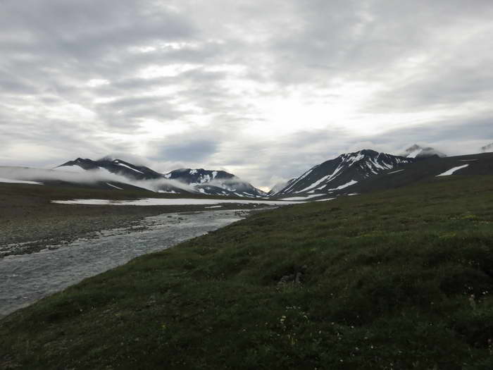 Вылезаем с галечников на тундровые склоны. Пора искать ровное место для лагеря, для нашей Базы 1. Склоны сочатся ручьями, сырые, кочковатые. Но вот вижу прекрасную терраску размером три метра на пять. Ровная, сплошь покрытая именно тем тундровым ковром, который я так люблю. Рядом — небольшой курумничек, два на два, как раз, чтобы сделать здесь закладку — прикопать катамаран.