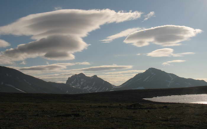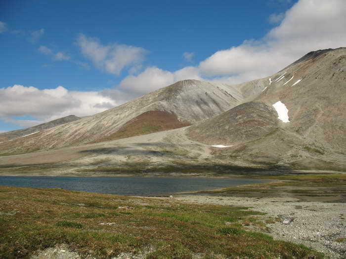 Окраска склонов удивительно пастельная — светло-жёлтая, местами полосатая с чёрным, с зелёными тундровыми пятнами внизу, с синевой воды, отражающей небо.