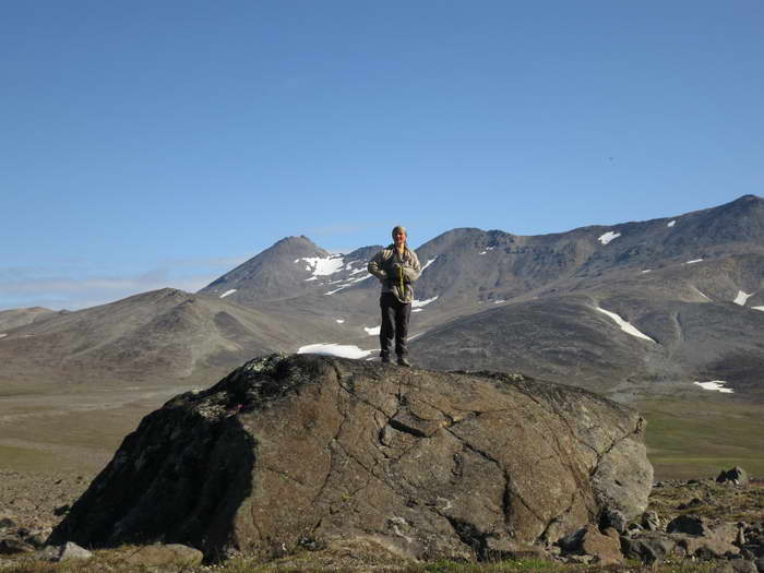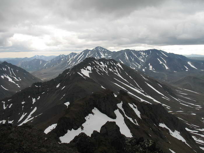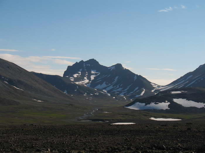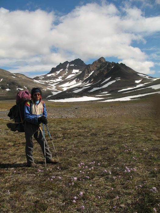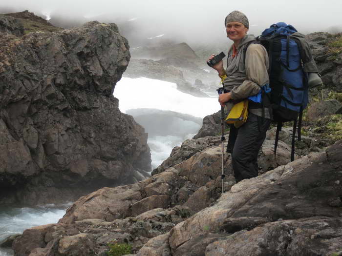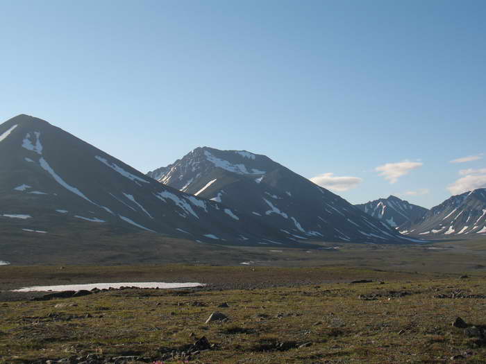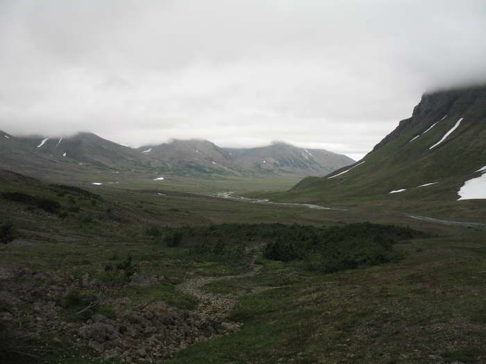 Возникла забавная ассоциация, что вот так же хрустит на далеком тёплом пляже песок под ногами какого- нибудь загорелого мачо, обнимающего стройную креолку цвета шоколада. А мы, поскрипывая снегом, неплохо перезимовываем это лето, бродя по снежникам, галечникам и тундрам центральной части Чукотского полуострова, в самом сердце хребта Пекульней.