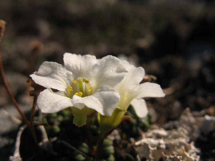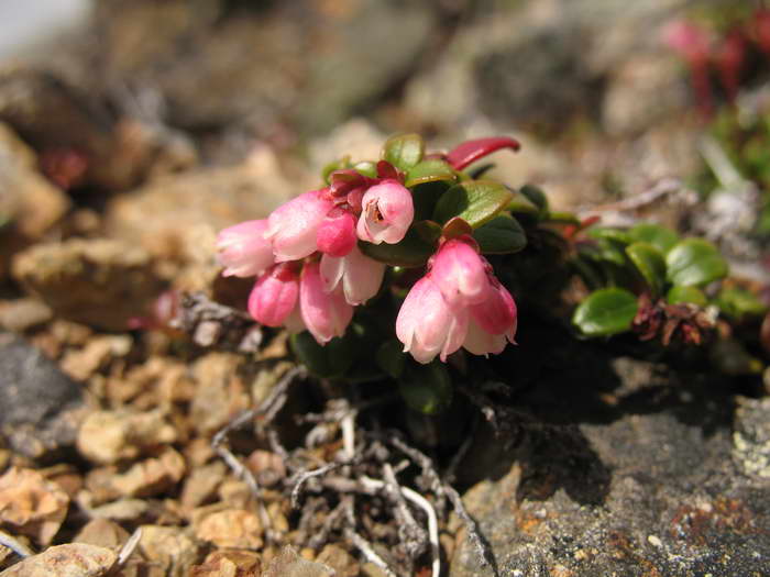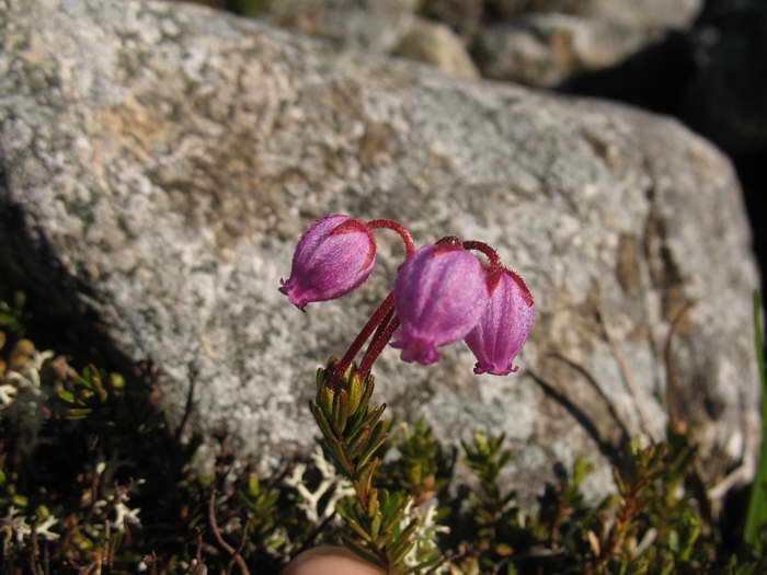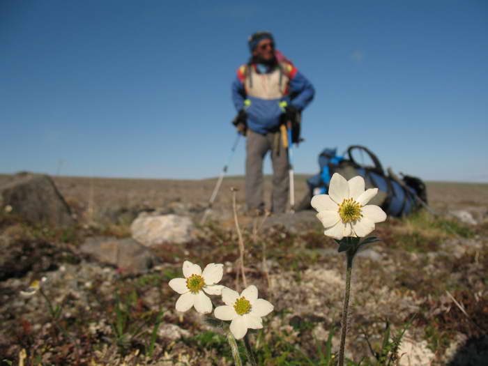 Тундровые волны плоского водораздела между рекой Поперечной и озером Пекульнейгытгын с их озерцами и снежниками остаются позади. Первый перекур после сорока минут хода приходится на большущий камень. Он один здесь такой. В его трещинах и углублениях цветут розовые цветы! И как они тут не вымерзают?