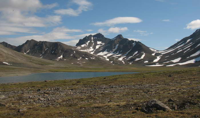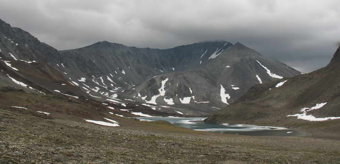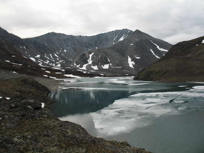 Потом под ногами хрустит длинный пологий снежник, затем галечные берега первого озера Каменистого, затем тундровые лужайки второго.
