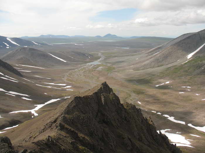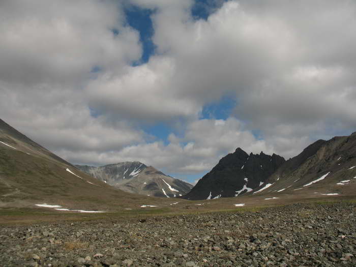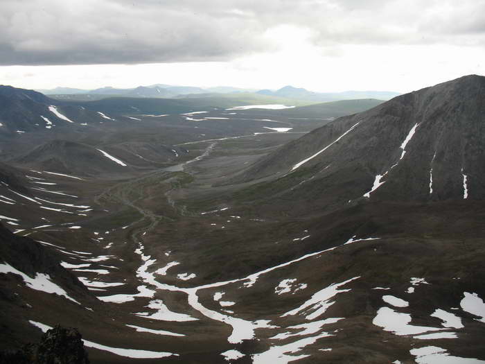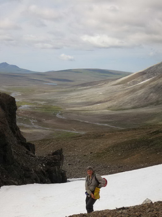 Идём вверх, к перевалу. Небольшой снежник радует звенящим ручейком. За спиной постепенно распахивается вся широкая долина верховьев Поперечной, видно уже озеро Пекульней.