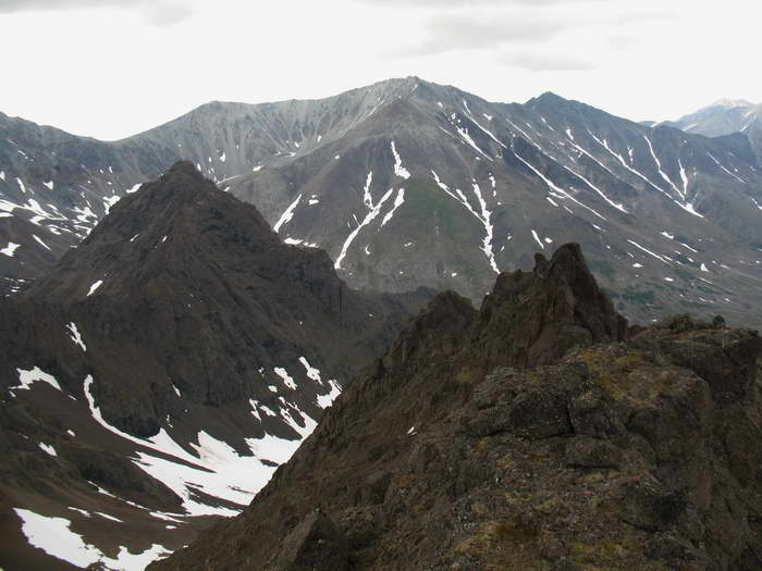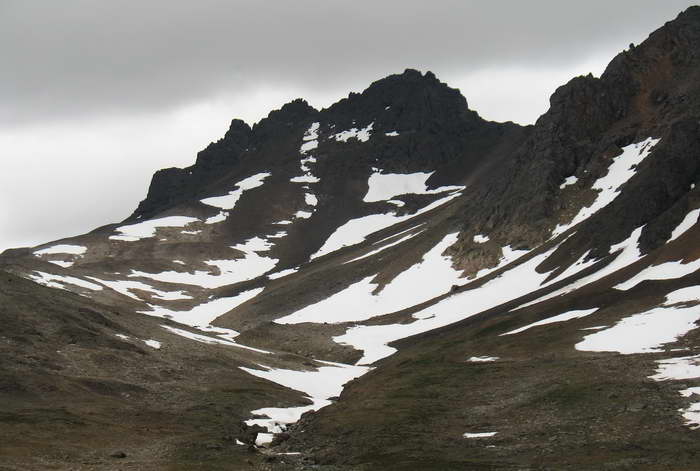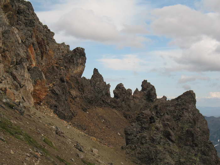 Впереди предстоит лазанье вверх-вниз через кулуары и снежники, некрутое, но муторное. Это траверс хребта с западной стороны под всеми жандармами, вместе взятыми. И вылезем мы туда, куда привело бы нас ответвление снежника, пойди мы сразу, снизу, вторым, снежным путем. Получается, мы выбрали более сложный путь. Ну что ж. Описания поднявшихся сюда людей нет, вот мы и идем методом проб и ошибок. Ну уж мы-то в отчёте об этом напишем, и наши последователи будут точно знать, где идти попроще!