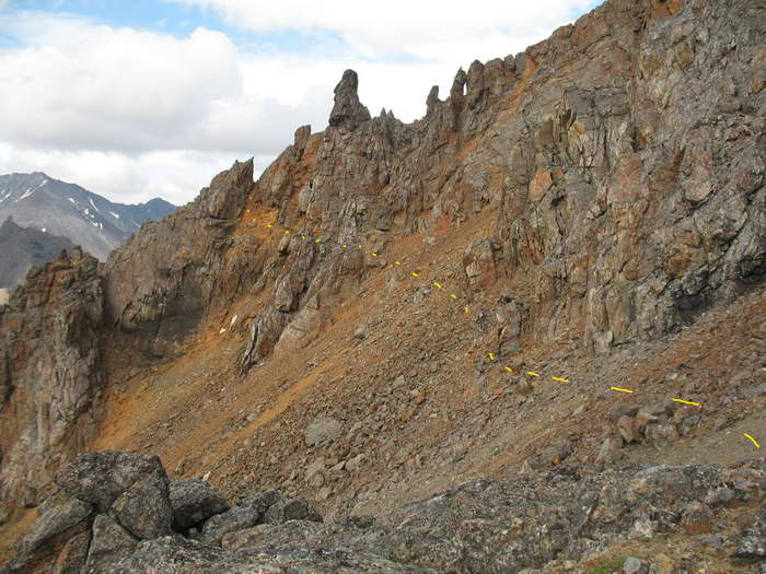 Один из отрогов снежника выводит к крутой осыпи справа от вершинной башни, к понижению в хребте между нею и большим жандармом. Над осыпью видны довольно крутые, но не отвесные сбросы. По идее можно подниматься и там. Здесь решать Викторычу. Простой путь по снежнику и осыпи он видит тоже. Но он верит первопроходцам и выбирает путь по рекомендации Седова, сначала на перевал Трезубец, а там видно будет.