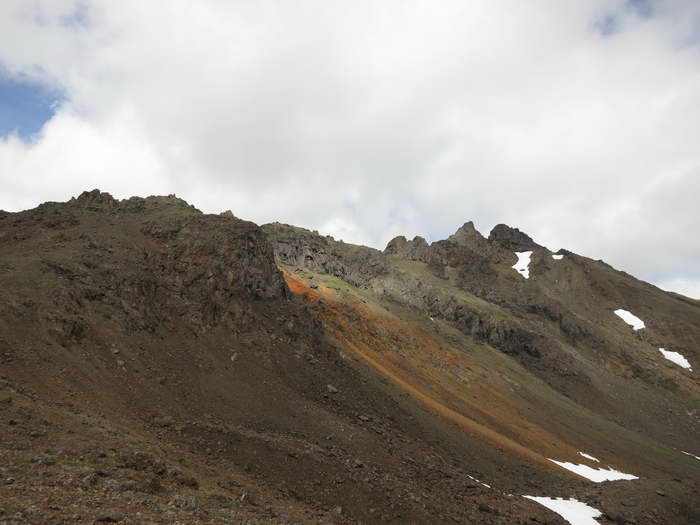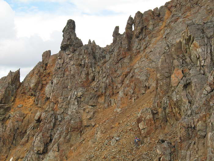 Отсюда становится видно, что подниматься придется прямо по гребню, по жандармам. Никакого обхода с изнаночной стороны нет. Зато есть интересная красная осыпь, и видно место, откуда выкрашиваются и сползают вниз красные камни.