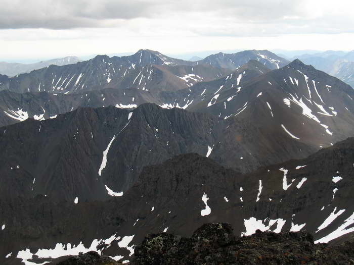 С перевала очень хорошо видно, насколько восточная сторона подножия гор ниже западной — спуск в ту сторону круче, ущелья ручьёв глубже. На востоке лесная зона подступает прямо к горам. А на западе до нее пара десятков километров, не меньше.