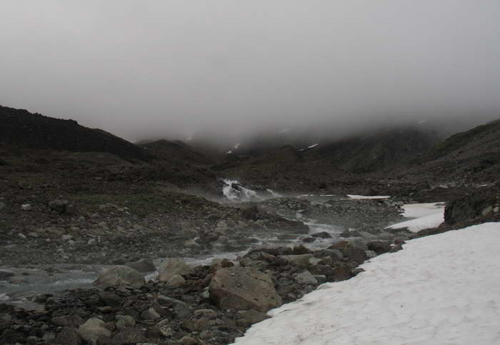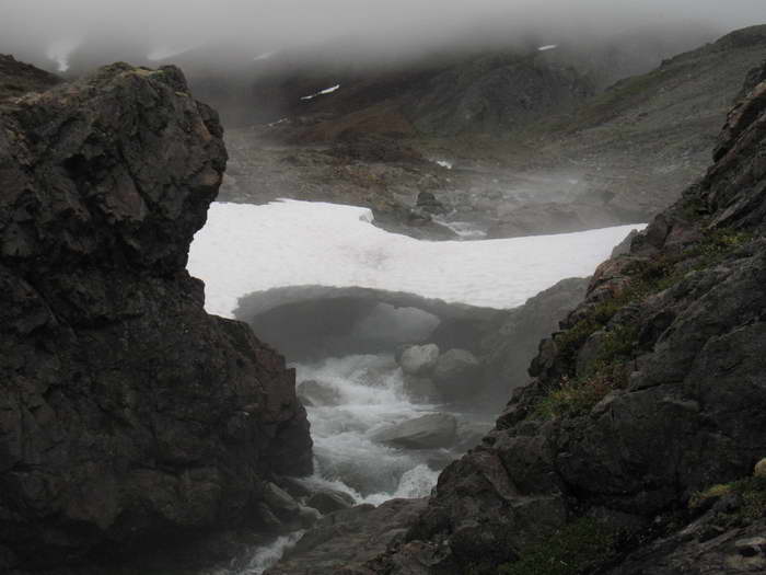 Есть снежные мостики в суровых скальных стенах, вода чистая, зеленоватая, по берегам цветочные полянки — вроде все симпатично, вполне уютно. Но ровная граница облаков ворует простор и свободу. Чувствуешь себя будто в помещении, накрытом сводом. Да и сумеречно из-за плотной облачности.
