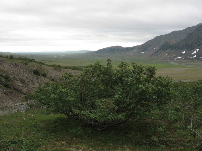Долина быстро становится шире. Лесная зона появляется удивительно быстро. Ольховник сначала по колено, затем в рост, жмётся к горам, в распадки.