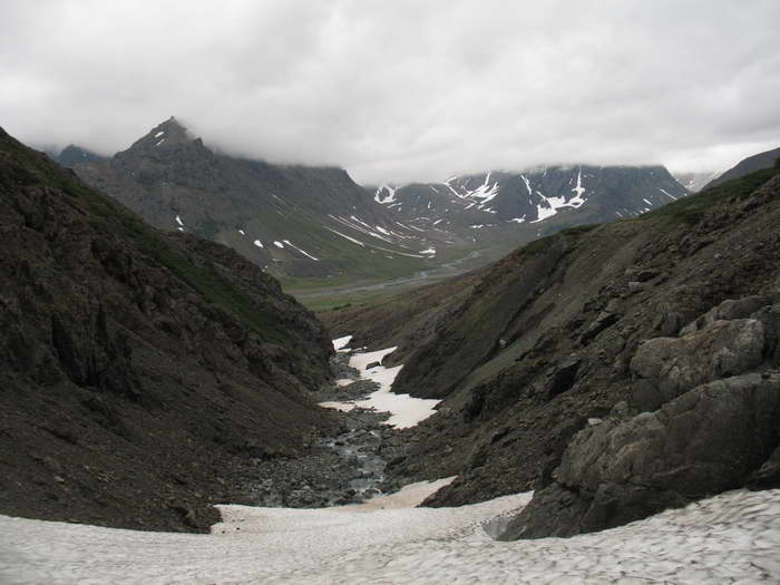 Снежник становится положе, идти нормально, довольно легко. Здесь уже можно снять накомарник — в ущелье холодно.