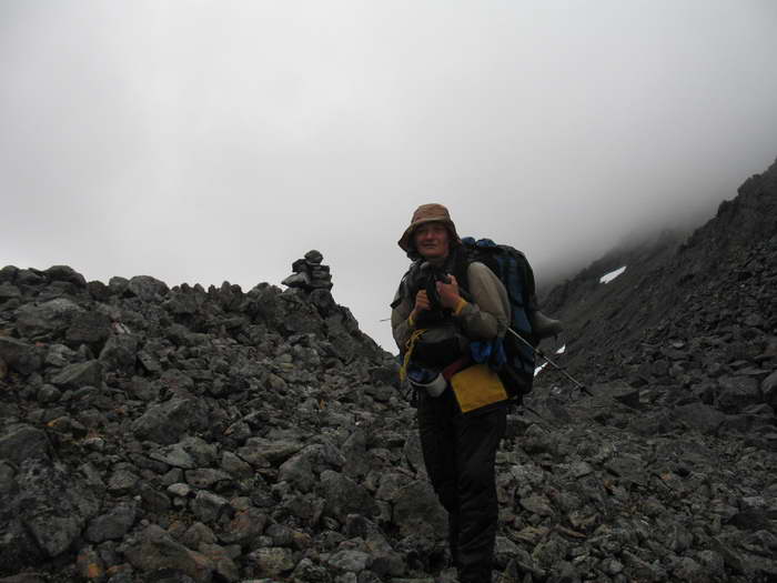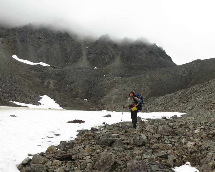 Перевал Репер нас, признаться, удивил. Точно найти перевальную точку не оказалось возможным — моренные кучи, как отвалы свежей земли на стройке, лежат в беспорядке, чернеют среди снежников. Вид марсианский, нереальный. К тому же туман. Рельеф скрадывается, расстояния не оцениваются. Уклон чувствуется только ногами. Затерянный мир — таким предстало перед нами перевальное плато Репер.