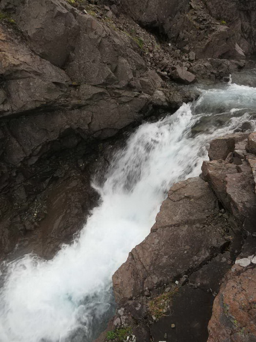 Переходим её выше начала каньона и идем рядом, по скальному борту. Седов здесь не ходил. Они спускались с перевала Красный, а окончание спуска с него находится почти напротив перевала Взлёт. Значит, водопады в этом каньоне ещё никто не пересчитал.