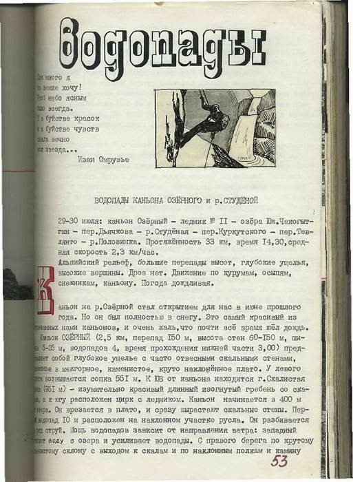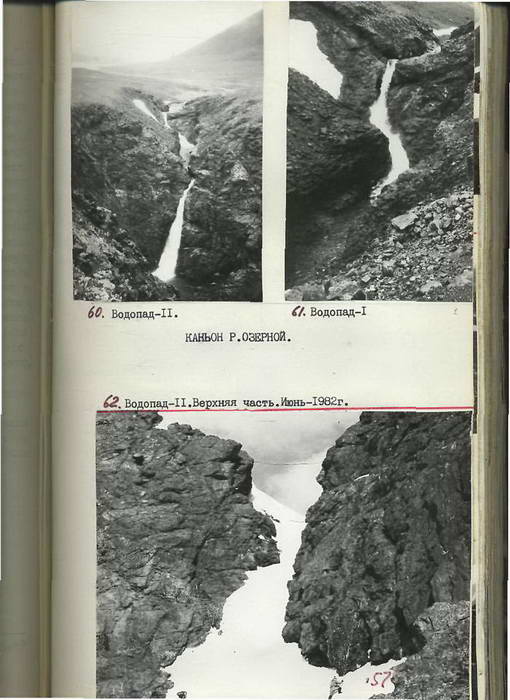 «Каньон реки Озёрной (1Б) расположен на притоке Студеной и начинается в 0,5 км от озера. Это наиболее красивый и сложный из водопадных щелей Пекульнея. К юго-востоку от каньона находится гора Скалистая Стена (951м) с изумительно красивым изогнутым гребнем. В глубоком каре на притоке Озерной лежит ледник. Длина каньона 2,5км, ширина 5-25м, высота стен 50-150м, водопадов 4, перепад высот 150м. Он представляет собой глубокое ущелье с часто отвесными стенами, врезанное в троговую долину с большим уклоном. Первый из водопадов расположен на наклонной ступени русла. Высота его 10м. Он разбивается на несколько струй. К нему можно спуститься с правого берега по крутому каменистому склону с участком скал. Отрезок каньона до второго водопада узкий, с вертикальными стенами. Он имеет высоту 20м, падает из узкой щели. За расширением скального коридора в крутом повороте гремит третий водопад высотой 15м. На левом берегу здесь примечательная отвесная скальная стена. На обеих сторонах каньона крутые осыпные кулуары могут быть путями спуска. Дальше, на расстоянии 0,8км в каньоне идут скально-проходимые прижимы, каменистые пляжи. На склонах много останцов разных форм, в нижних частях кулуаров сохраняется снег.