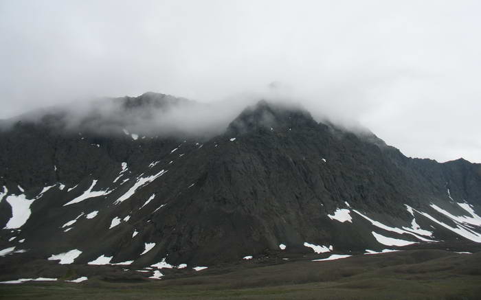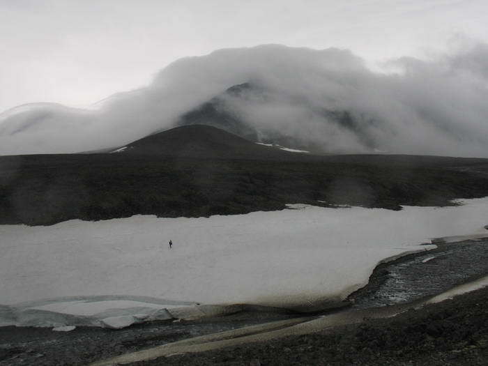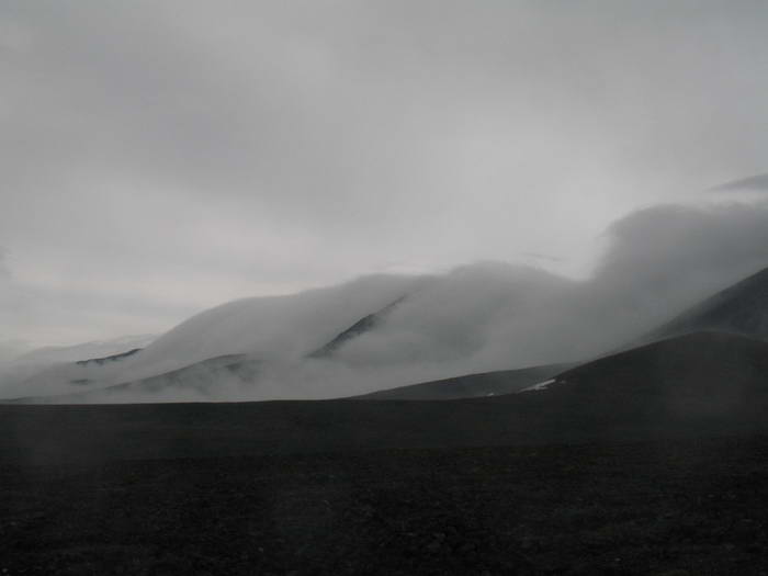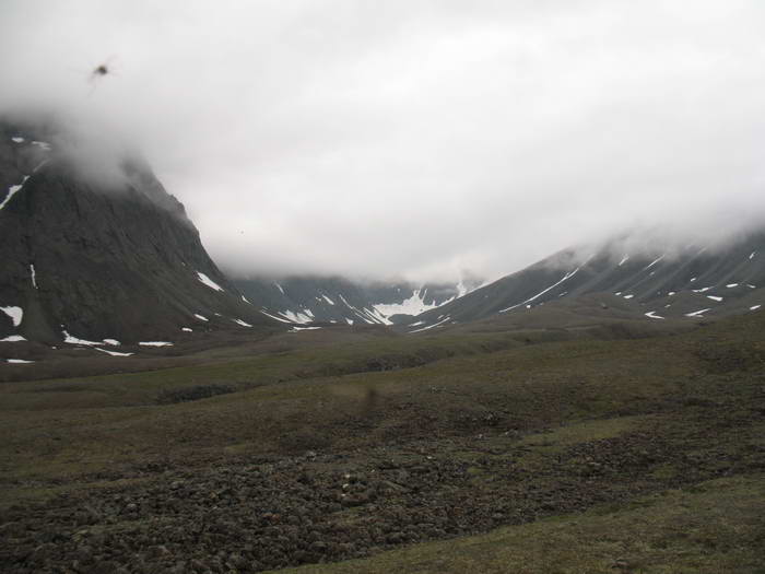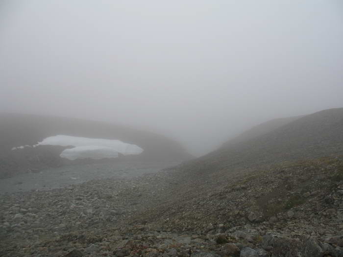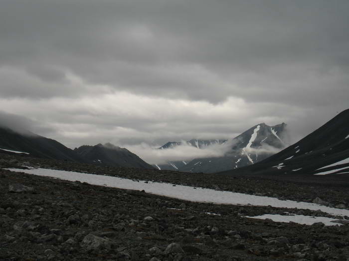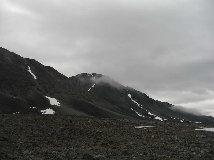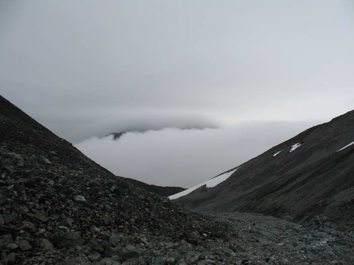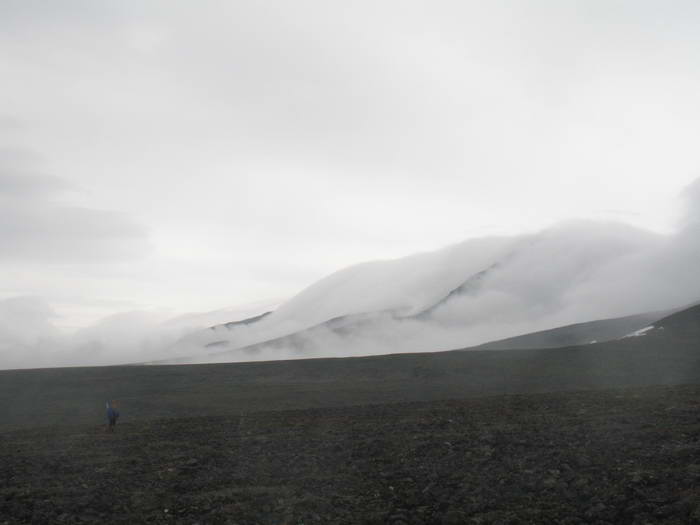Выходим. Пока мы внизу, в долинке ручья, все вроде не сложно и черт нам не брат. Но вот мы вылезаем наверх. Защиты склона теперь нет, кругом тундра. Горы конечно рядом, но они скрыты под серой мутной зачёсанной пеленой. А впереди в непосредственной близости та самая полоса серого тумана, несущегося со скоростью поезда.