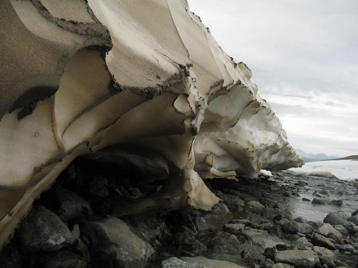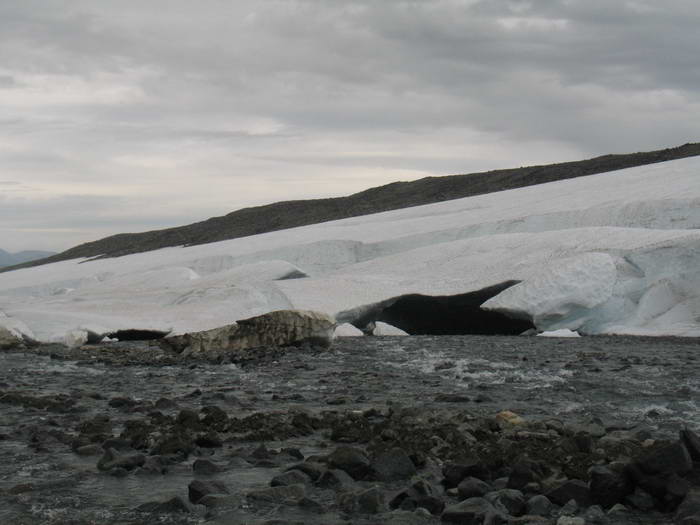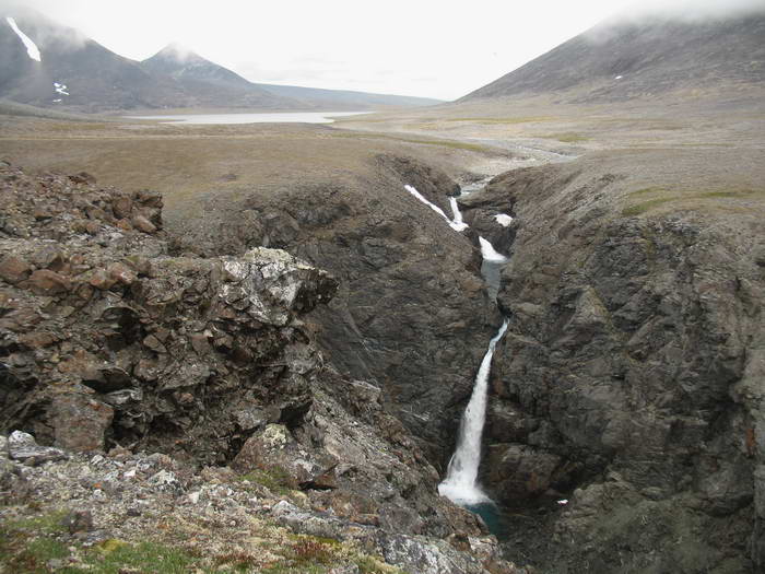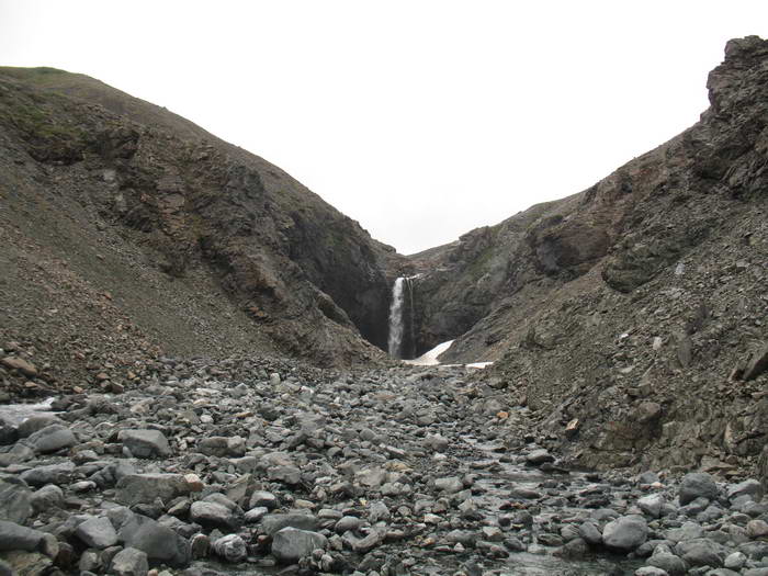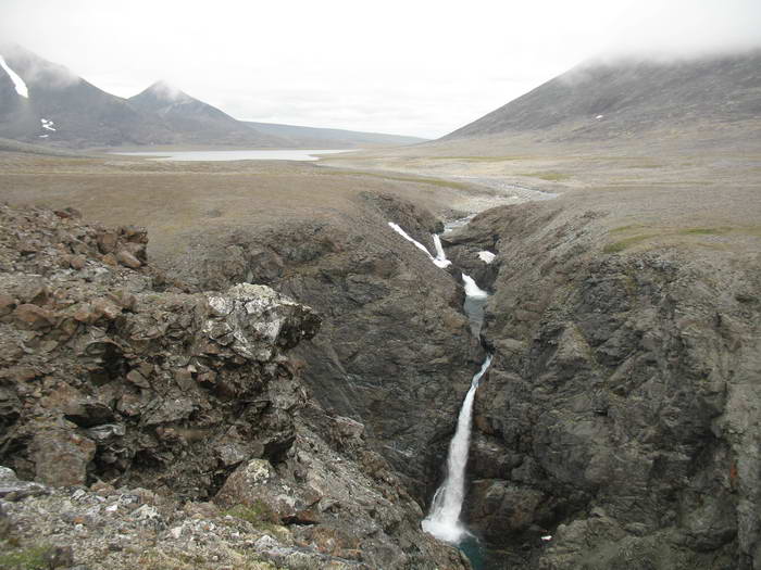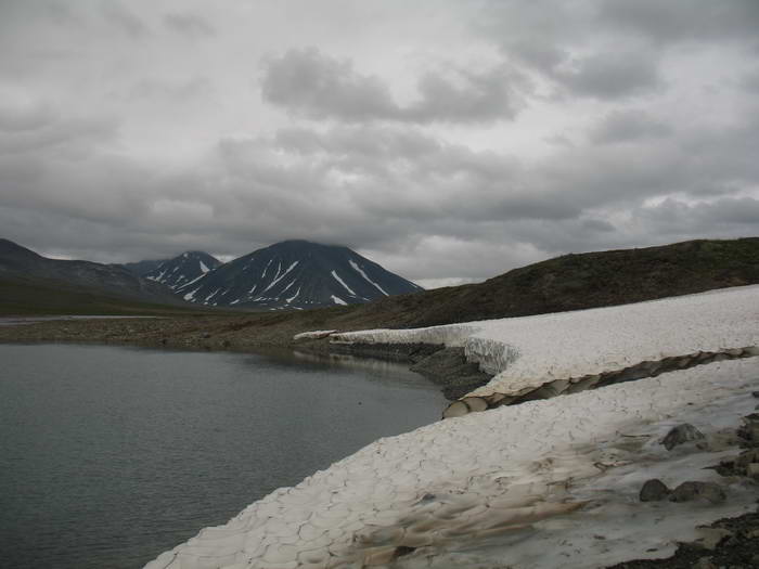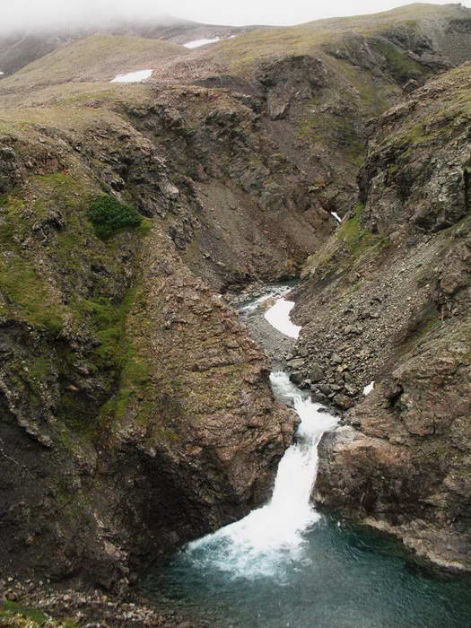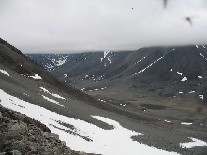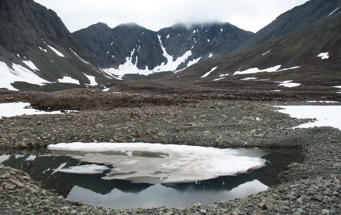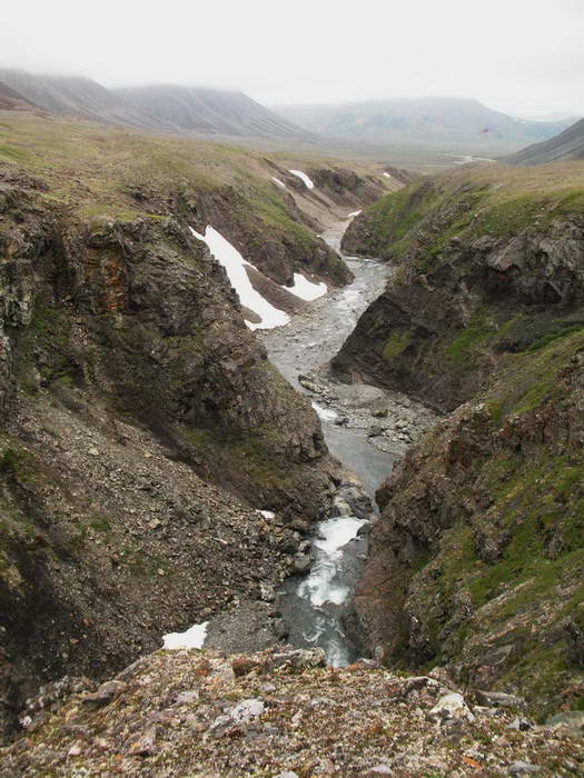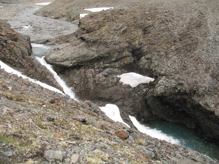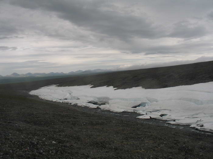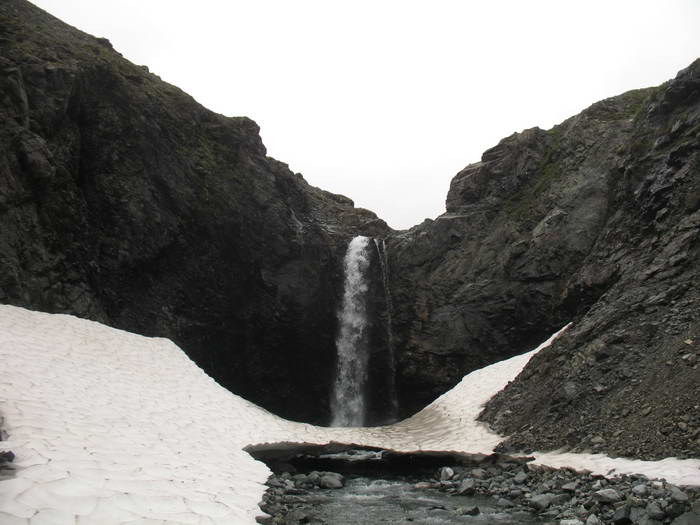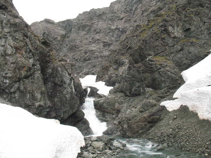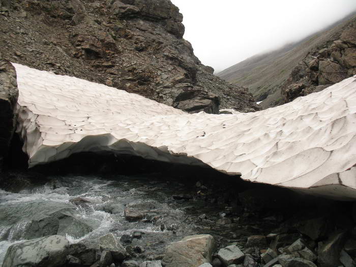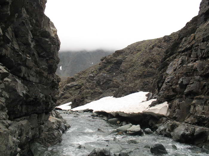 Оказалось, у него множество параллельных истоков, а мы оказались на такой высоте, что приходится пересекать их все по очереди. Лишь четвертый или пятый распадок был на самом деле ручьём Солнечный — с невысокими стенками каньонообразное довольно крутопадающее для тундрового ручья русло, забитое снежником по всей ширине от края до края. Нам остаётся пройти вверх по снежнику пару километров, максимально подобраться к озёрам, но не спускаться к ним.