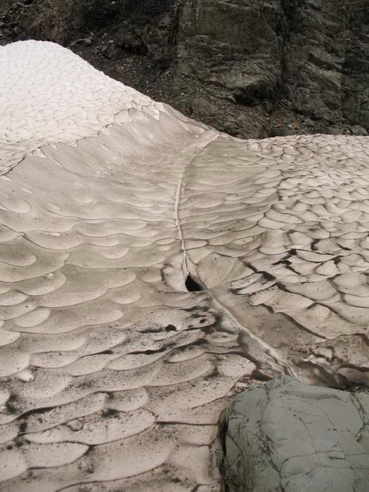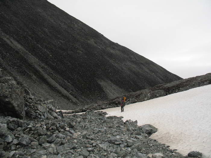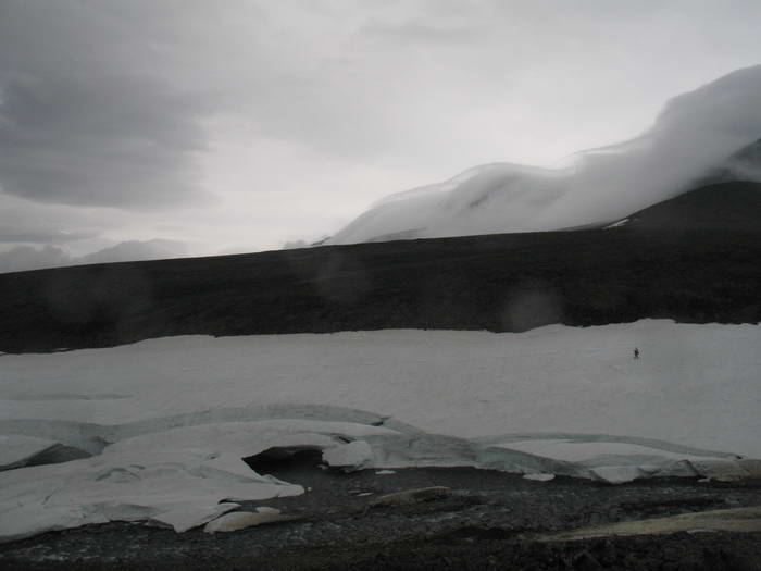 Ошибаюсь чуток при спуске, брожу не там и не так, в спешке вылезаю на толстенный снежник, вроде бы даже вижу его следы. Скорей наверх — воон он, на пределе видимости вижу его силуэт. Бросаюсь в погоню.