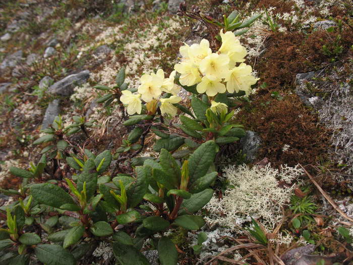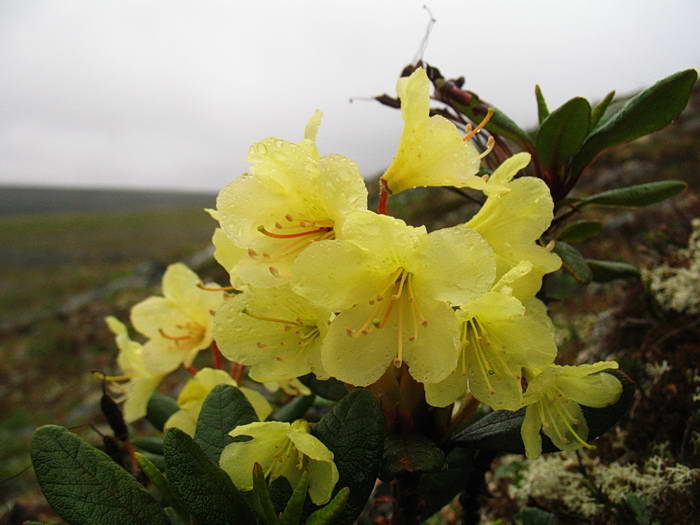 Цветы крупные, почти как на Кавказе! Фотографирую находку. Интересно, биологи знают, что на Чукотке недалеко от Полярного круга растут желтые рододендроны?