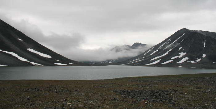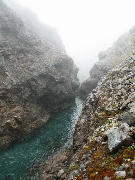 Огромный моренный вынос, тундровые лужайки, заболоченное глиняное подножие горы, широко разлившийся, но очень мелкий ручей со стороны перевала Озёрный — все эти картинки как в калейдоскопе быстро сменяют одна другую. По правую руку в тумане прячется склон горы, я его не вижу совсем. По левую — лежит озеро. Это самое большое озеро в системе озер Южные Чекогытгын. Из восточного угла вытекает река Озёрная. Дальнего его края, да и вообще всего озера я тоже не вижу. Ориентируюсь сейчас по кромке воды.