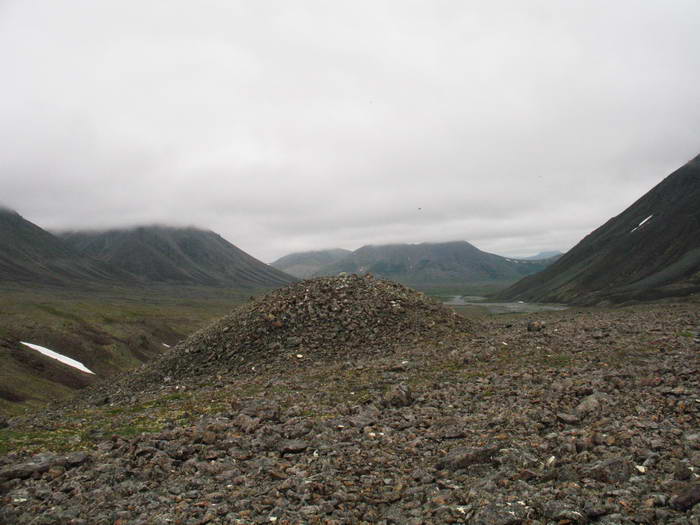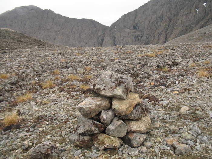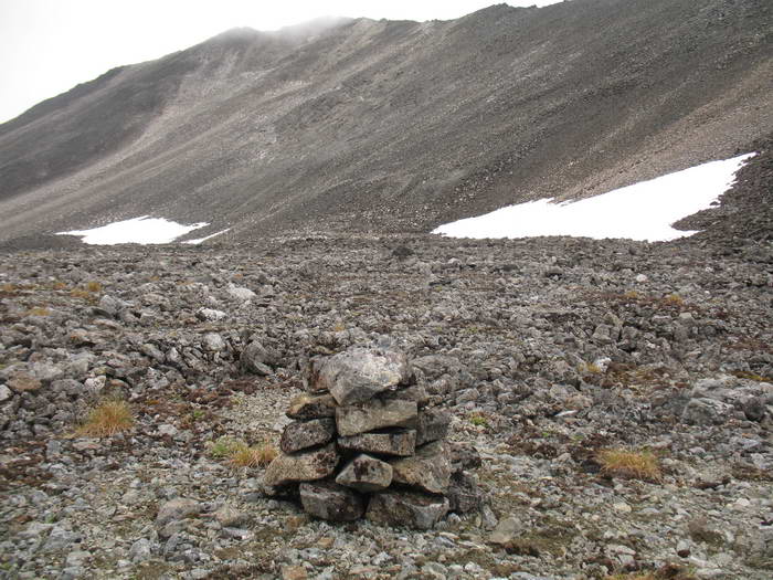 Перевал широченный, десяток стадионов точно поместится. Обшариваю вооруженным глазом — вроде бы вижу какую-то плиту и на ней тур. Но все сливается: каменные камни на фоне каменных камней. Ладно, сбегаю.