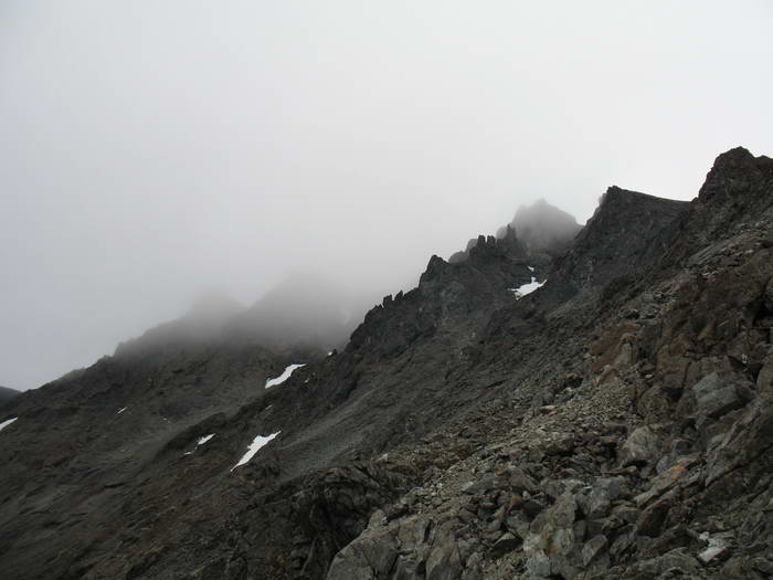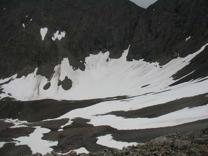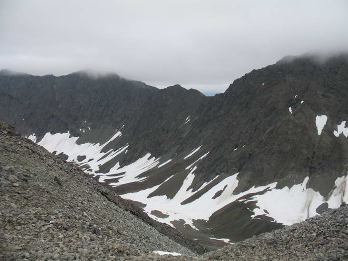 С появлением переднего плана в кадре появляется глубина — распадок, ручей, за ним обширный снежник с маленькой черной точкой — Викторыч карабкается уже на ту сторону. За снежником — диковинный начёс на склоне гор. Хороший кадр. Хоть и мутный, но зато передаёт реальную обстановку — сумрачно, сурово. Жаль, воя и скорости ветра не чувствуется. Вот бы изобрели фотоаппараты, которые могли бы фотографировать ветер, скорость, влажность, дождь, холод, запах. Ощущения, одним словом!