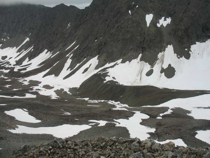 Впереди глубокий распадок со снежником. Нам таких предстоит пересечь четыре.