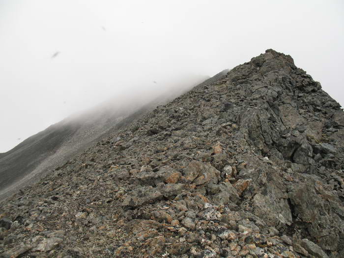 Каньона нет, снежники, галечники. Внизу у озёр белой ватой лежит туман. Или облако. Мы неминуемо спустимся в него.
