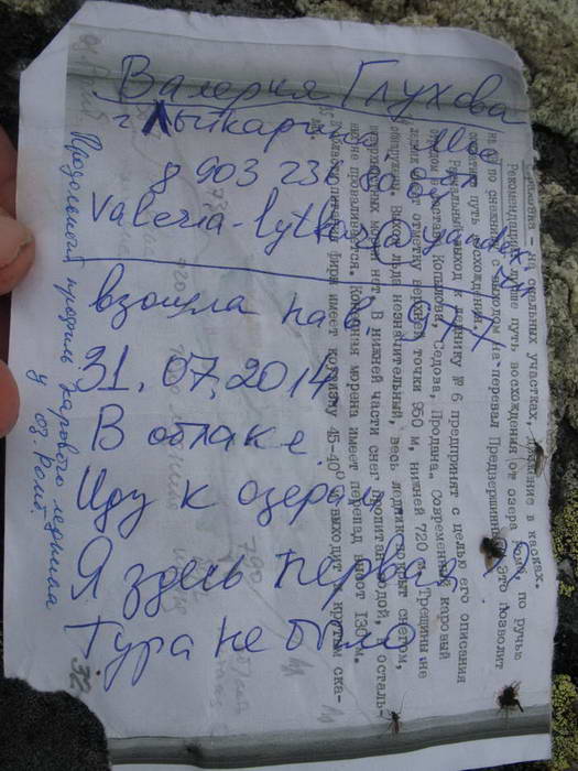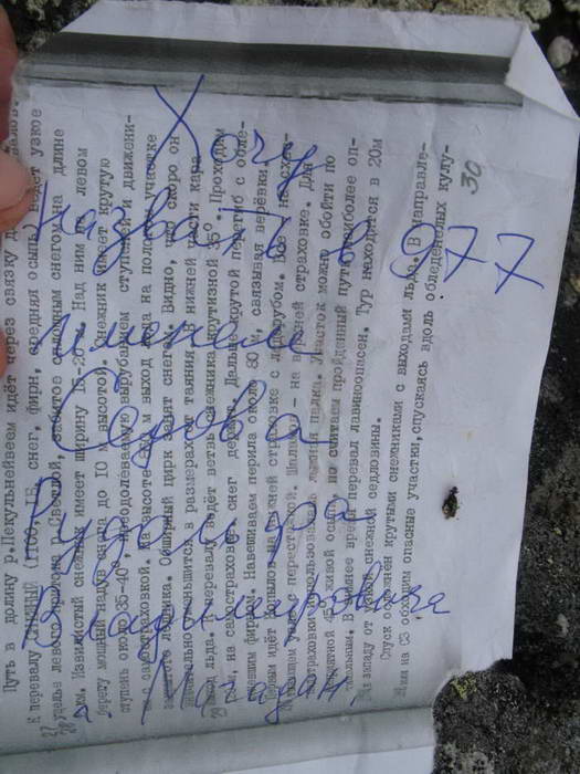 Иду. Вот вроде бы и перевал, широко, поэтому неконкретно. Где плита-то, что привиделась? Ни плиты, ни тура, ни записки. Эхх, только время потеряла. Скорей домой, времени уже половина одиннадцатого. Полтора часа осталось, а мне еще около пяти километров по камням скакать. Чувствую себя Золушкой, спешащей к своей карете — обещала же, нужно выполнять.