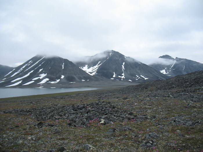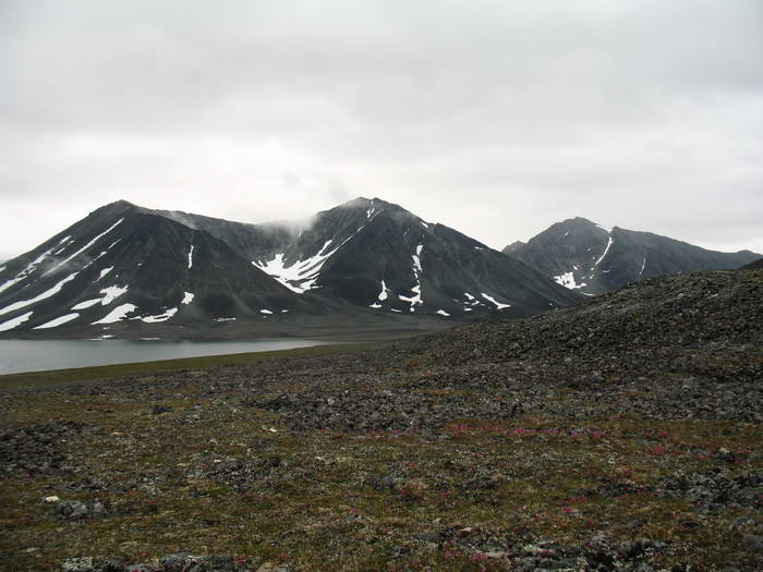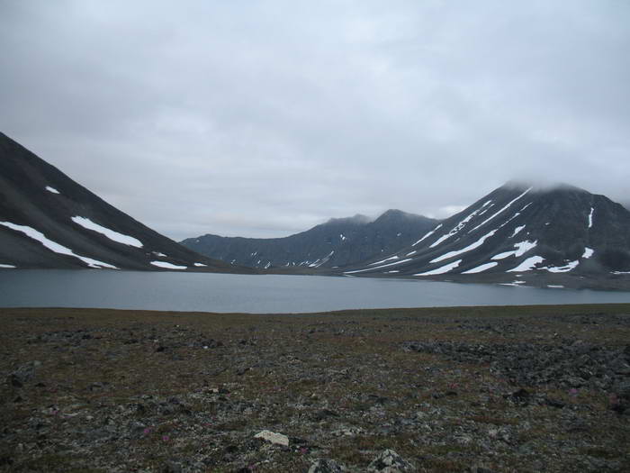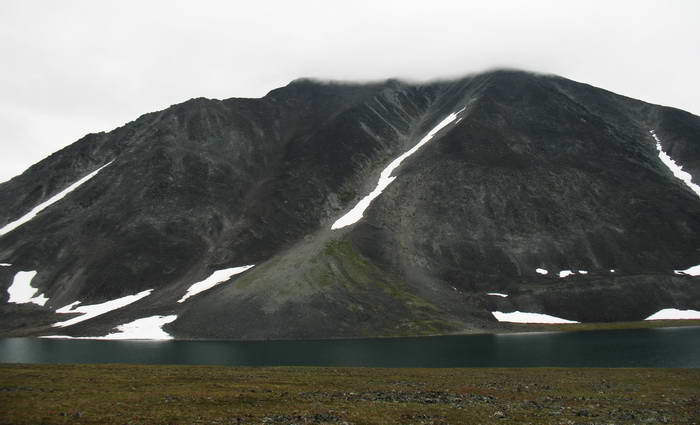 Выходим из гор к озеру — дует. Всё же сильновато дует для постановки лагеря на тундровой полянке.