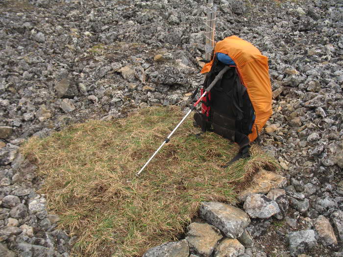 Олег несколько часов потратил на обустройство места под палатку: на камнях в тени морены, куда мы спрятались от ветра, он сделал трехслойный настил из травяного дёрна, срезанного им на лужайке. Ставить палатку прямо на лужайке было нельзя из-за ветра. Ну хоть делом был занят, не сидел. Спать не мог — волновался. Есть без меня тоже не стал. Ну в общем стоит на минуточку оставить королевство… 😉