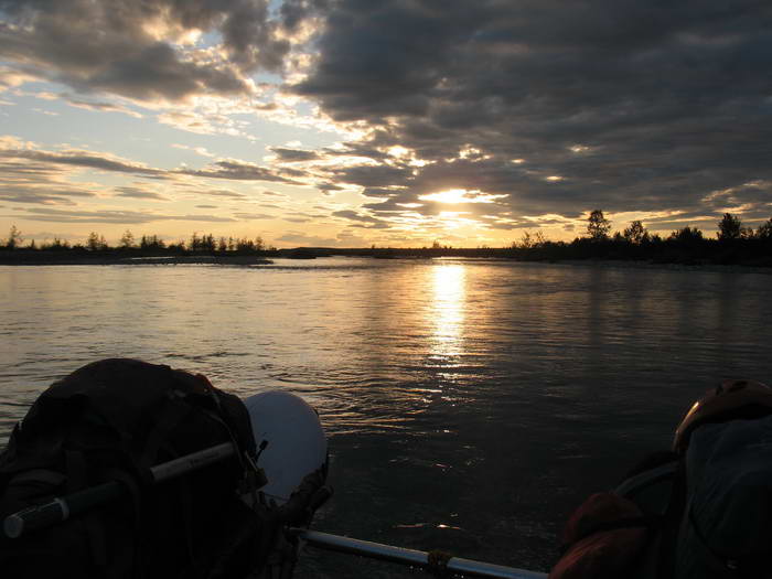 Мы, конечно, спешим, но в какой-то момент приходит понимание, что нам-то удобно, конечно, приплыть сегодня, попариться, переночевать, а с утра двигаться дальше. А вот хозяевам наверное ночные гости будут не очень удобны. Понимание это приходит в ещё не очень поздних сумерках. До Базы ещё десятка, а уже очень хочется спать и особенно есть, пока ещё есть ЧТО. На сегодня и половину завтрашнего дня еда ещё есть: в ход пойдет НЗ. Вот завтра точно надо будет добираться до заброски в устье Афонькиной, ибо продуктов с собой даже на завтрашний вечер у нас уже нет. Начинаем подъедать НЗ-шный карпюр и последнее сухое мясо.