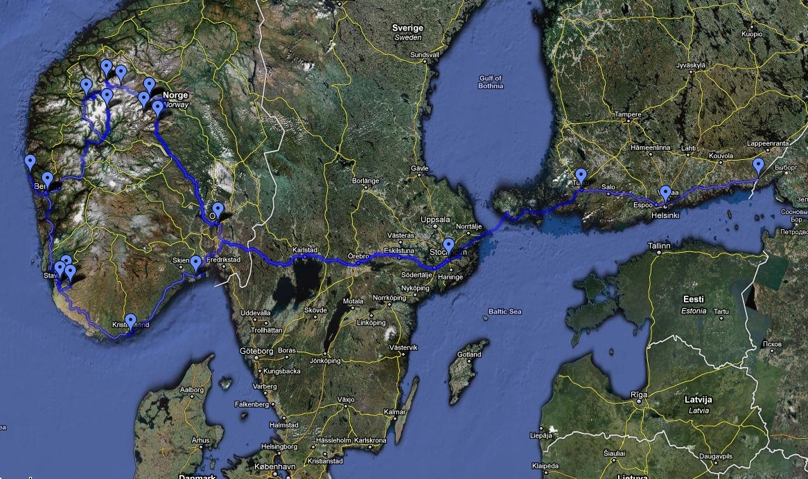 Позвали с собой в поездку Степановых, с которыми замечательно съездили по Исландии два года назад.Решили ехать двумя машинами прямо из Москвы. Предполагалась смотреть фьорды вместе, а потом разъехаться:мы с Андреем – в горы, а Степановы хотели посмотреть города и поездить по Швеции и Дании.