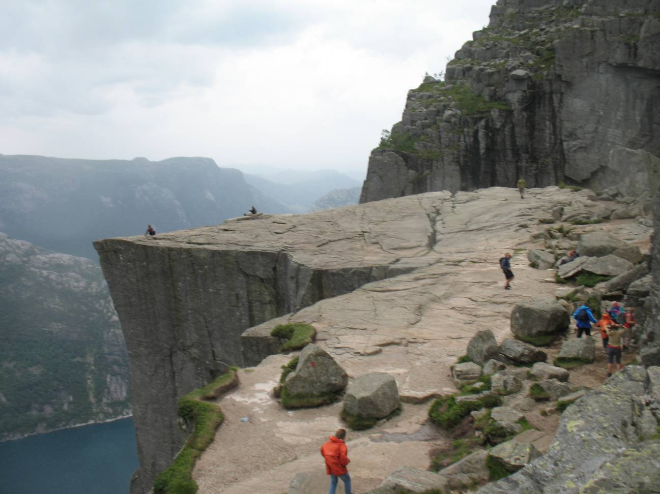 Это очень посещаемое место в Норвегии. Тропа промечена, большей частью идет по сыпухе, местами по болотам (там проложена гать) и временами довольно круто. До скалы мы шли 3 часа. Вид на фьорд и окрестные горы, который открывается сверху, конечно, стоит того, чтобы туда слазать. Правда начинается дождь и очень сильный ветер. На самой скале почти нет народа – туда очень страшно вылезать при таком ветре. Все жмутся к скалам. Так что фотографии у нас оказались довольно редкие: Preikesnolen без толпы народа на скале. Только самые отчаянные ползком подбираются к краю.