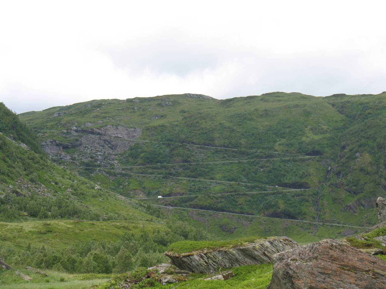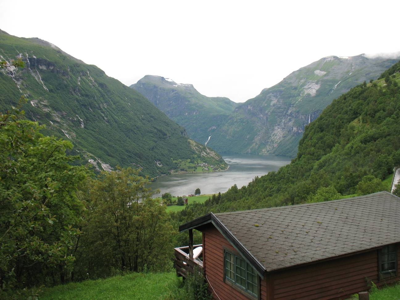 Некоторое время дорога идет по красивейшему плато, где вполне можно встать лагерем безо всяких кемпингов, а потом начинается умопомрачительный серпантин вниз, к Гейрангерфьорду. К сожалению, заснять это зрелище на видео невозможно – камера еще не высохла после вчерашнего дождя.